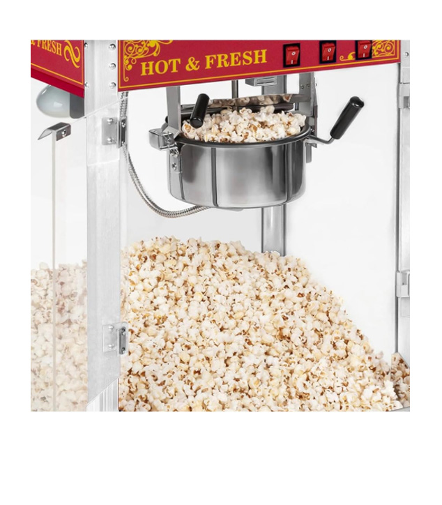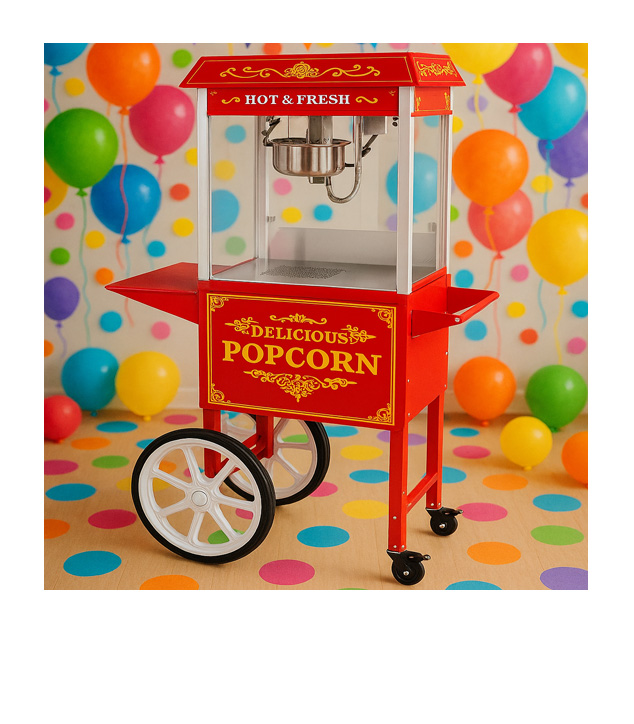 Unsere coole Popcornmaschine, die nicht nur ein echter Hingucker ist, sondern auch köstliches Popcorn zaubert.