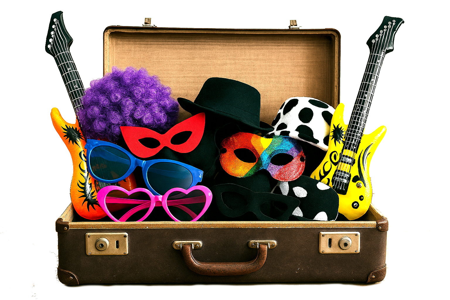 Mit einer kleinen Auswahl an Masken und Brillen sowie Luftgitarren
